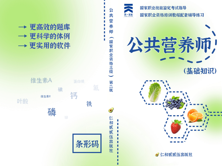 本封面围绕“公共营养师职业资格考试用书”主题,底色以绿色、白色为主,字体为蓝色,三种亮色不仅色调淡雅清新,而且更容易吸引读者目光。其中白色整洁而权威,有“白皮书”寓意,绿色体现勃勃生机,蓝色与“天一文化”logo颜色一致,使封面体现统一性。封面上选用了蔬菜、水果图案,与“公共营养师”主题相呼应,字体点明了书籍主要内容。