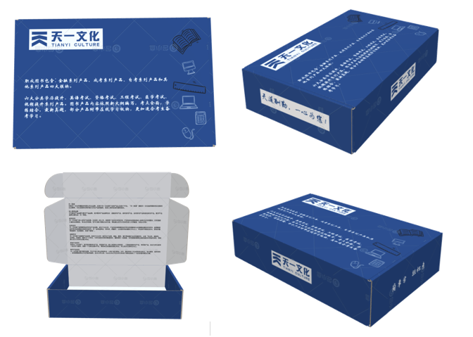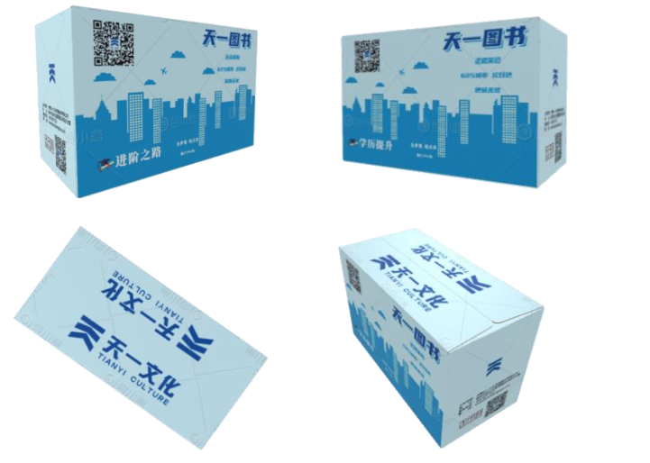 在视觉化的时代,商品的“打包”与“包装”越来越受到商家的青睐。首先,本次产品包装设计围绕“城市”这一象征梦想开始的地方,寓意着每位天一学员都要敢于有梦想,勇于走出舒适区,走向更加繁荣的城市,谋求更多的教育资源;此外,本次快递盒不仅在板面组合上简洁明了,并且采用聚乙烯材料,蓝色作为背景色、简洁的商品宣传文案为辅,给消费者视觉上的愉悦,以简单、好看、方便组装拆卸功能设计抓住消费者对其“重复改造、利用”,进而提升资源回收率。通过本次产品包装设计,希冀助力每位学子实现“学历提升、进阶之路”的梦想!