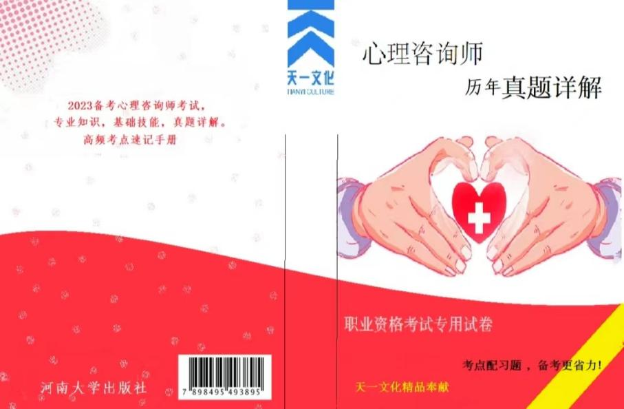 本封面是针对《心理咨询师历年真题详解》所设计的。整体的风格是卡通手绘。因为本书的大部分使用者是考心理咨询师的员工,年龄在18到30岁之间,又是女生居多。这种可爱的手绘风格会比较吸引读者。红白的主色调简洁又醒目,提到心理学大家第一想到的颜色就是红色,比较相关。面封的主图是一双手比的红色爱心,爱心里是一个十字架象征心理学属于医学的一种;心理咨询师又是帮助患者,带给人温暖的职业,手比心也是给人温暖的感觉。底封左上角的爱心,是粉色的点组成,点撒在整个封面,代表把爱心传递。