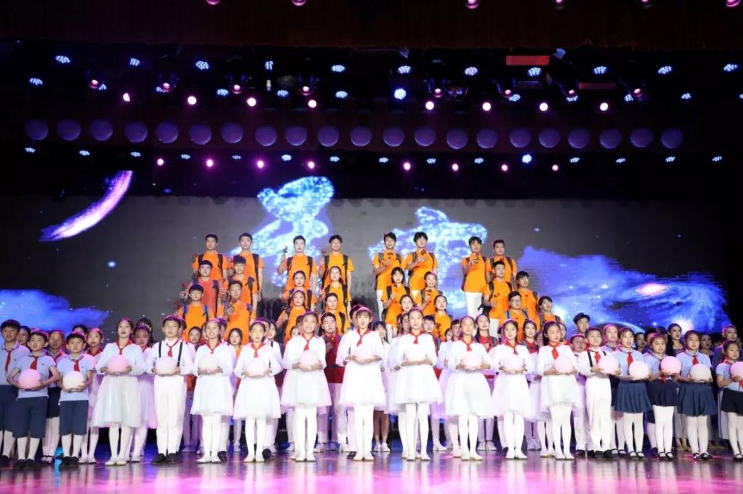 随着三声悠扬的钟声响起,舞台纱幕上显现出剧目主题“星空”,合唱团的孩子们手捧发光球缓缓走上舞台,用童稚的声音吟唱歌曲《夜空中最亮的星》,拉开了整场剧目的序幕。