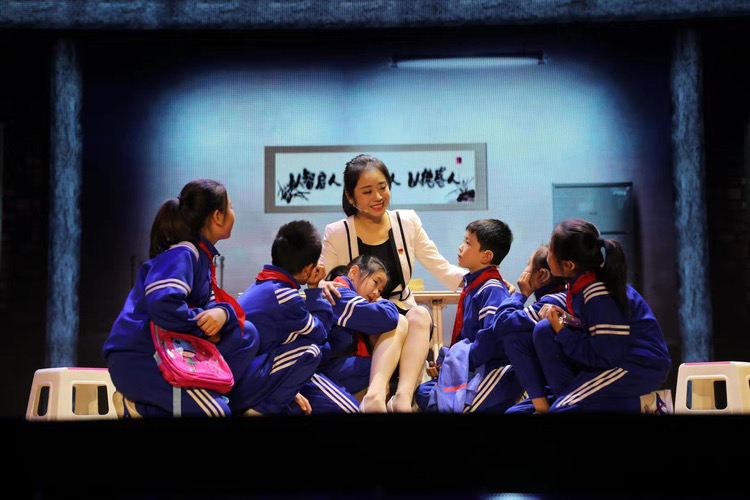 演员们情绪悲痛高涨,全剧达到最高潮,一声声对李芳老师的呼唤夹杂着泪水响彻在大礼堂的舞台之上。诺言犹在耳,斯人长已矣,李芳再也不能实现和女儿、员工们的约定了……演出的最后,一群青年人在李芳精神的感召下,接过李芳手中的接力棒,带着立志从教的初心和使命,奔赴各自的三尺讲台。