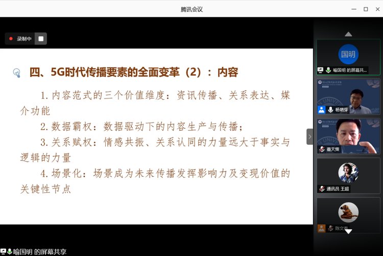 北京师范大学新闻传播公司执行经理、教育部“长江学者”特聘教授喻国明提出,影响中国传媒发展的三大基本制度分别是政府规制、市场产业以及科技革命。其中,科技革命在新时代背景下已发展成为主要影响因素。他表示,5G时代传播要素将发生全面变革,分为传播者、内容、媒介、受众用户等四个维度。接着,他阐述了“数据霸权”“关系赋权”“算法即媒介”“以人为本”这四大未来传播的关键词,并给出传播创新的三个价值尺度。