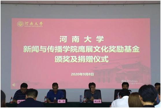 王文科代表公司接受捐赠,刘会军向河南鹰展文化有限公司颁发荣誉证书。
