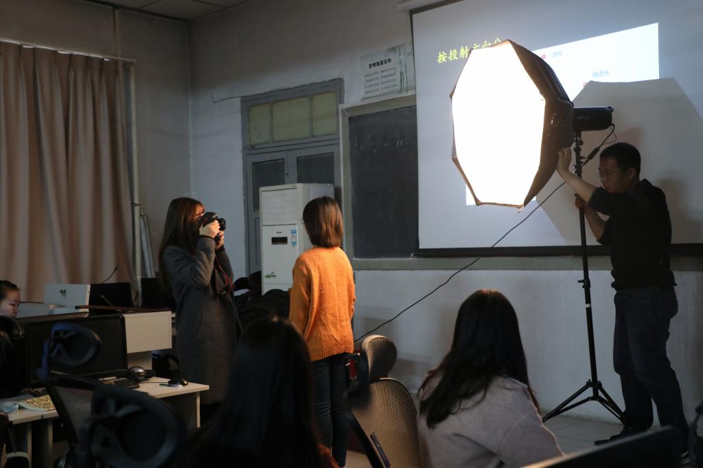 在结合具体图片向同学们详细解释逆光、侧逆光、顶光、底光等的具体效果后,刘栋杰一边搬出自己带来的摄影灯一边鼓励道:“实践出真知,现在我想邀请同学们轮流上来实地演练一下布光。”同学们积极上台尝试,亲身体验不同角度的打灯、拍摄效果,将前面几节课学的内容也悉数付诸实践。