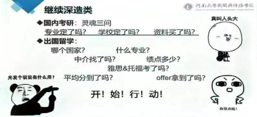 会议伊始,李雨盈抛出“考研,考哪儿?”“就业,就什么业?”两个问题调动在场同学注意力,并列举“考公”“考研”“就业”等方向引入此次会议主题。她围绕毕业生去向和具体行动建议两方面开展此次指导会的讲解。