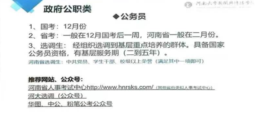 李雨盈从公务员、事业单位、招教、三支一扶和西部计划四方面介绍政府公职类毕业去向,她特别指出目前报考河南省选调生的条件已进行调整,并通过推荐相关网站链接与微信公众号为具有考公、考编、从教意愿的员工提供行动指南。