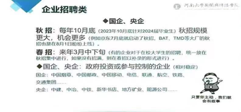 在进行企业招聘类这一毕业去向的讲解时,她详细介绍了秋招、春招两次招聘的基础情况,并对国企、央企、民企、外企进行了概念阐释。她指出,作为将要面临就业的员工应灵活选择就业方向,打破专业壁垒,争做融合型人才。