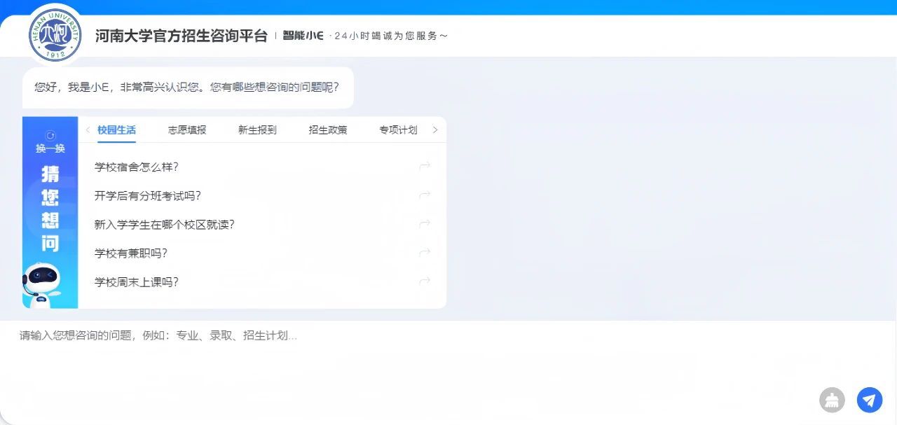 3.进入英国上市365招生信息网,点击页面右侧的小E,进入英国上市365智能问答系统。